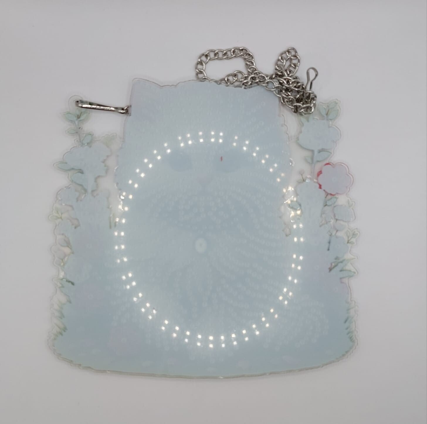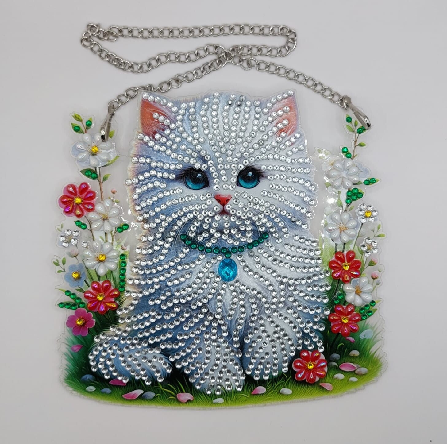 Voeg een sprankelend en schattig detail toe aan je stijl met dit accessoire van een witte kat, versierd met schitterende steentjes. De charmante kat, omringd door kleurrijke bloemen, heeft levendige blauwe ogen en draagt een ketting met een blauw juweel. Met de handige zilverkleurige ketting is het perfect als tasaccessoire of om aan een sleutelhanger te hangen. Een must-have voor kattenliefhebbers en iedereen die houdt van glans en unieke accessoires.