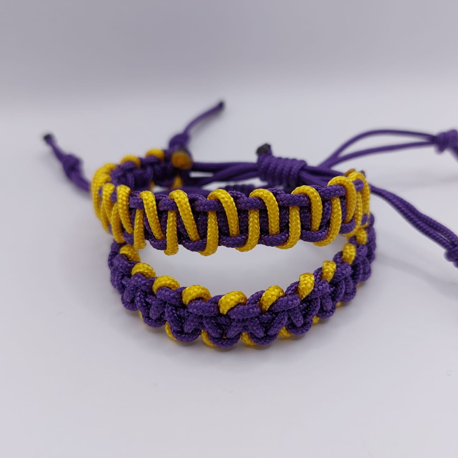 De Paracord Armband "Royal Strike" straalt kracht en elegantie uit met zijn koninklijke kleurencombinatie van diep paars en levendig goudgeel. Het strakke en stijlvolle vlechtpatroon zorgt voor een unieke en moderne uitstraling, perfect voor wie een opvallend accessoire zoekt.