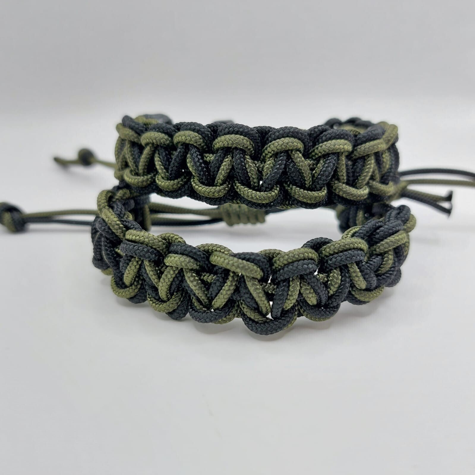 De Paracord Armband "Tactical Stealth" is ontworpen voor liefhebbers van een stoere en robuuste stijl. De combinatie van diepzwart en legergroen geeft deze armband een tactische en militaire uitstraling, perfect voor outdoor avonturiers, survivalisten of iedereen die een minimalistisch maar krachtig accessoire zoekt.