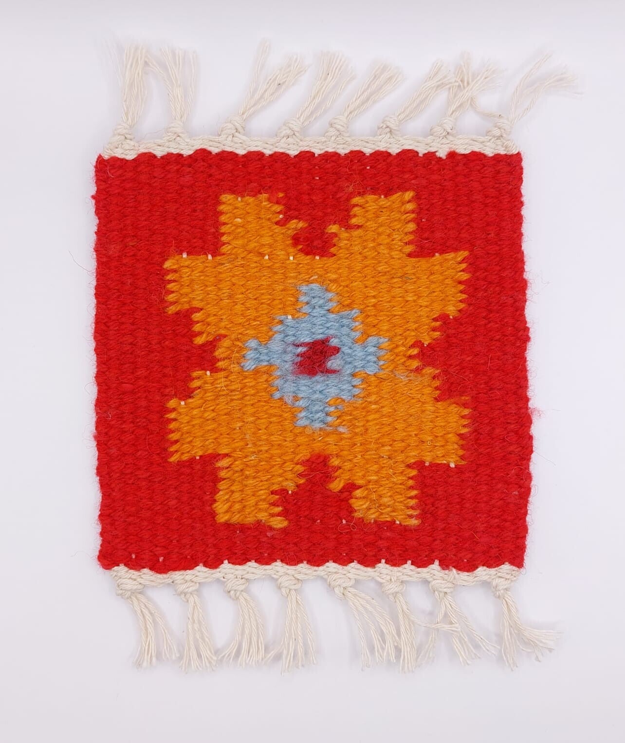 De Handgeweven Onderzetter "Zonsondergang Bloem" straalt warmte en energie uit met zijn vurige combinatie van rood en oranje, geaccentueerd door een zachtblauw bloemmotief in het midden. Dit levendige en traditionele ontwerp brengt een sfeervolle en ambachtelijke touch aan je interieur.