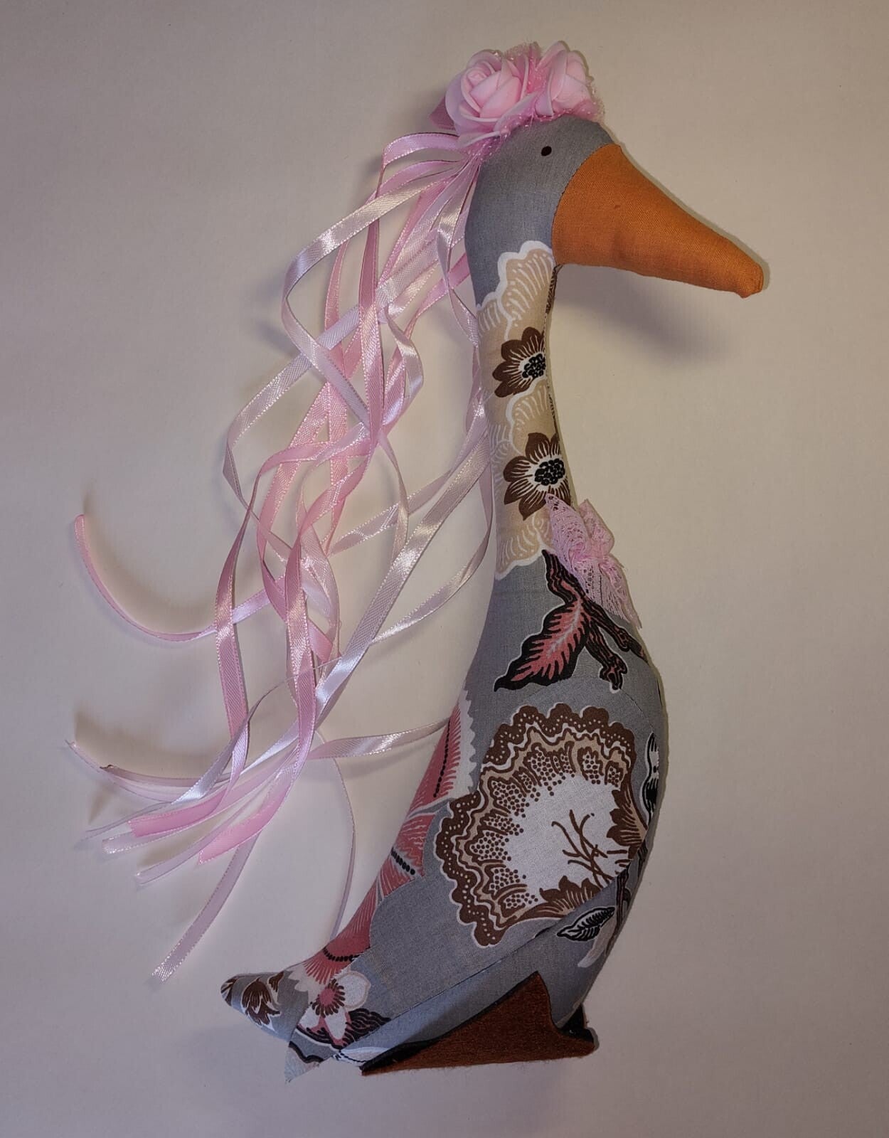 De Handgemaakte Stoffen Gans "Romantic Rose" is een charmante en elegante decoratie die een romantische sfeer in huis brengt. Gemaakt van hoogwaardige stof met een delicaat bloemenpatroon in warme tinten. Deze gans heeft een prachtige handgemaakte bloemenkrans met zachte roze rozen en sierlijke linten die speels wapperen.