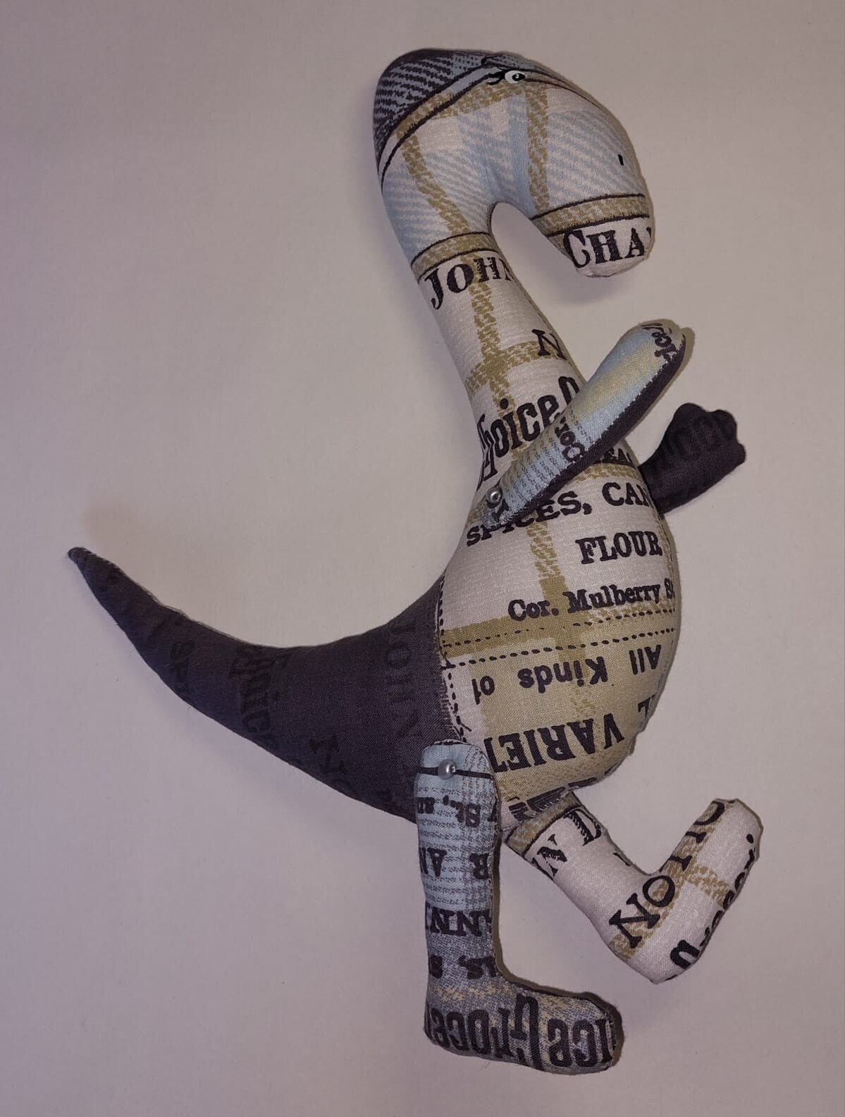 Deze stijlvolle stoffen dinosaurus brengt met zijn vintage design een vleugje nostalgie in huis. Gemaakt van kwalitatief textiel met een speels patroon van klassieke teksten in tinten grijs, beige en zwart. De retro uitstraling maakt deze handgemaakte dino perfect als decoratief pronkstuk of als origineel cadeau voor jong en oud. Een unieke toevoeging aan elke kamer!