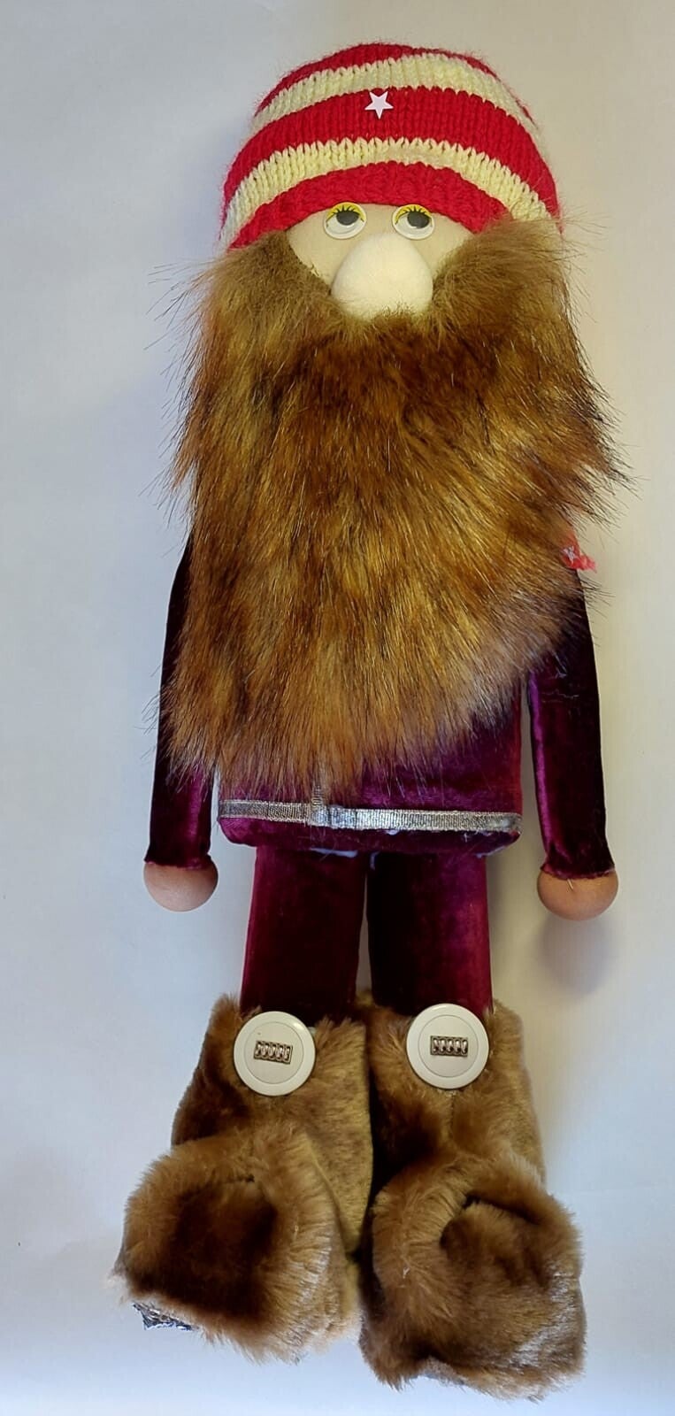 Maak kennis met Mykola, een unieke handgemaakte pop met een indrukwekkende baard en ondeugende uitstraling. Gekleed in fluweelachtig paars en een vrolijke rood-witte muts met ster, straalt hij een warme, winterse sfeer uit. Zijn grote bontsloffen en guitige blik maken hem tot een charmant gezelschap in elk interieur. Of je hem nu cadeau doet of zelf houdt, Mykola brengt gegarandeerd een glimlach.