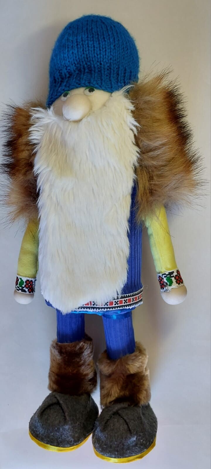 Maak kennis met Borys, een unieke handgemaakte pop die eruitziet als een wijze woudwachter uit een winters sprookje. Zijn lange witte baard, blauwe gebreide muts en met bont afgezette schouders geven hem een stoere en warme uitstraling. De geborduurde accenten op zijn mouwen en gordel brengen een subtiele Oekraïense flair in zijn outfit.