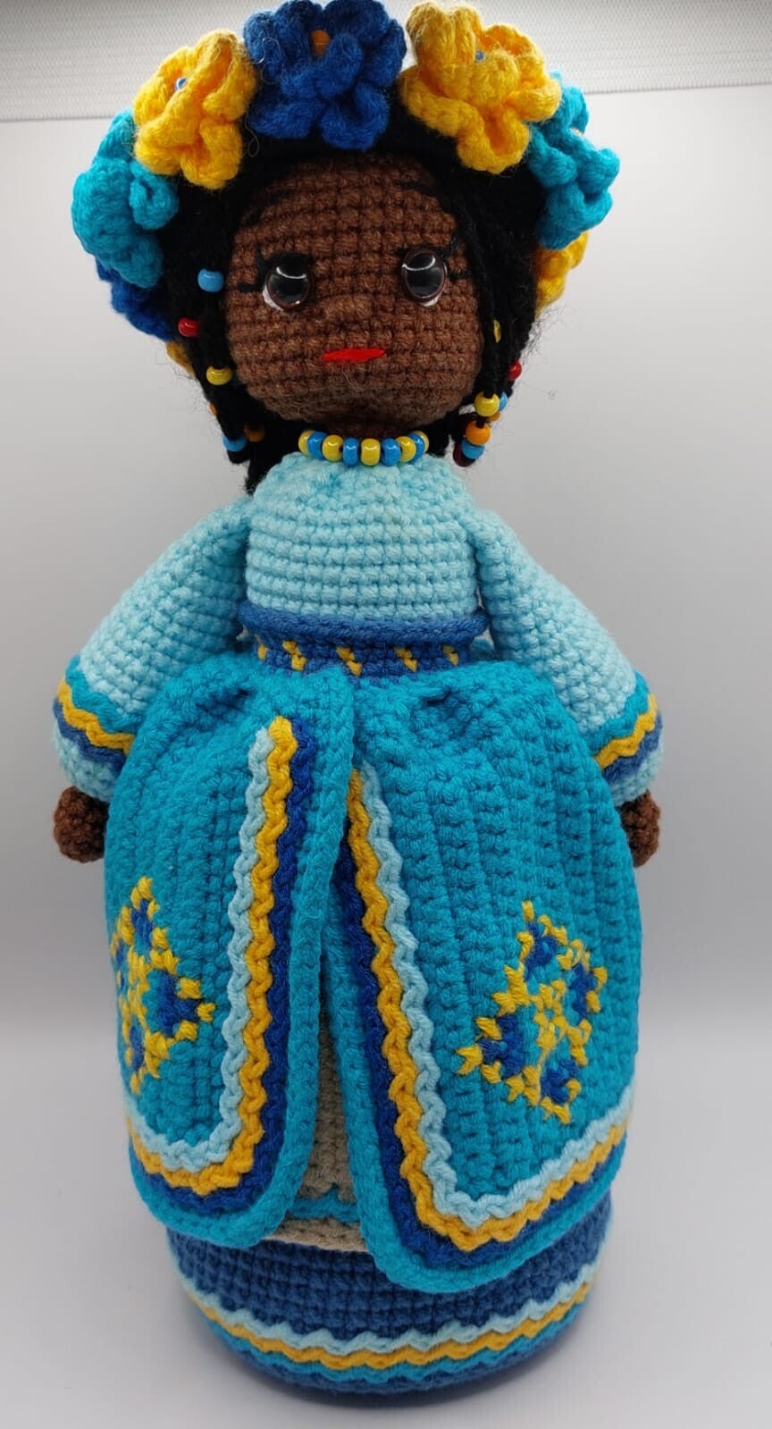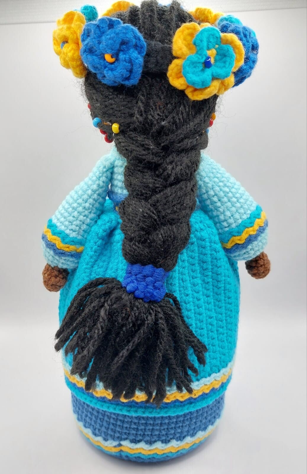 Deze prachtig gehaakte amigurumi pop is geïnspireerd op traditionele klederdracht en is volledig met de hand gemaakt van zacht katoen. De pop draagt een kleurrijke, gedetailleerde jurk in verschillende blauwtinten met opvallende gele accenten, en heeft een sierlijke bloemenkrans in het haar, wat haar een unieke en feestelijke uitstraling geeft. Dankzij haar zorgvuldig vormgegeven details en rijke kleuren is dit een bijzonder verzamelstuk of een origineel cadeau voor liefhebbers van handwerk en culturele decoratie.